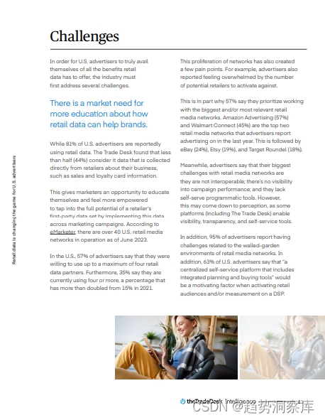 - 广告商面临的挑战包括零售媒体网络的不互通性、缺乏对活动表现的可见性、缺乏自助程序化工具,以及成本问题。