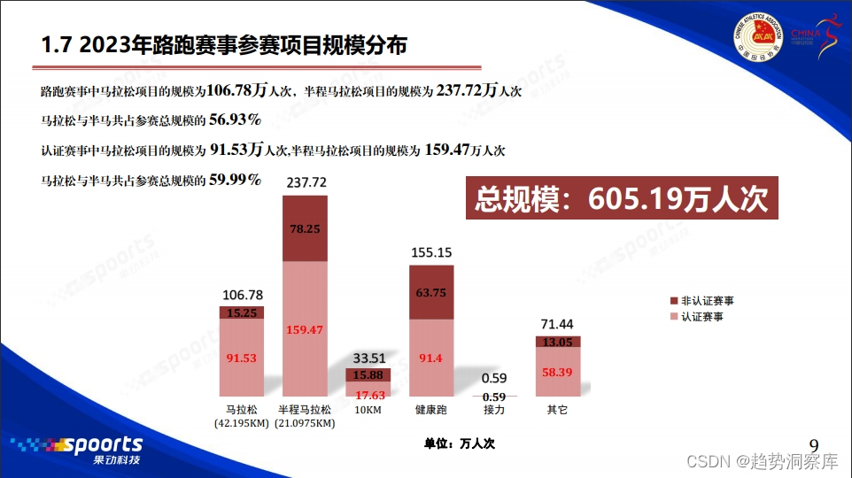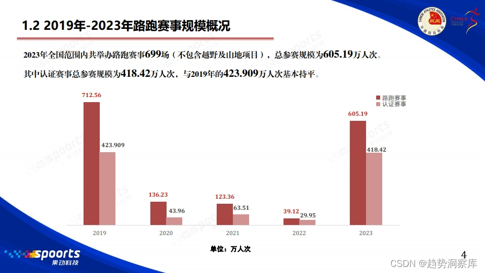 - 2023年的路跑赛事总参赛规模为605.19万人次,认证赛事总参赛规模为418.42万人次,与2019年基本持平。