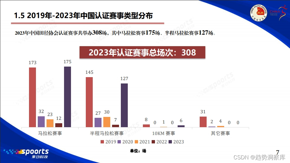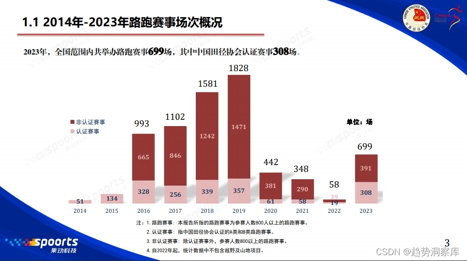 - 2023年,中国共举办路跑赛事699场,其中中国田径协会认证赛事308场。