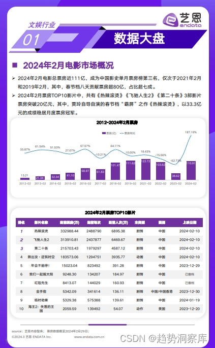 - 电影市场:2024年2月电影总票房达到111亿,成为中国影史单月票房第三名。春节档影片《热辣滚烫》、《飞驰人生2》、《第二十条》票房排名前三。