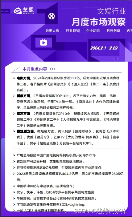 本文分析了2024年2月中国影视市场的票房、播放量、企业动态和科技创新情况,包括AI动画的发展、海外市场拓展、短剧市场的爆发、网游版号增长以及网文市场的繁荣。同时,内容营销活动也在不断创新,涉及多个行业合作与可持续发展项目。