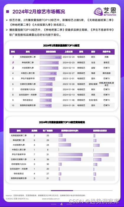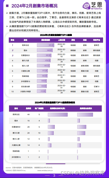 - 剧集市场:2月播放量指数TOP10中,腾讯、优酷、爱奇艺各上线三部,芒果TV上线一部。《南来北往》在品牌合作方面领先。