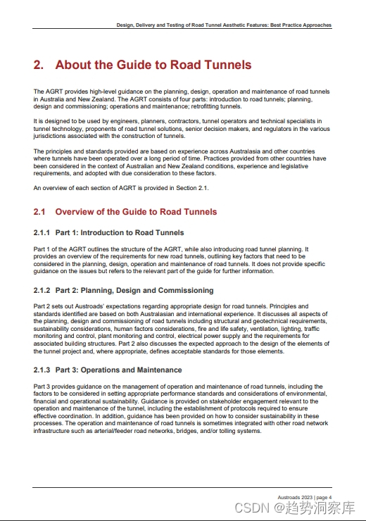 - 《公路隧道指南》(AGRT)为澳大利亚和新西兰的公路隧道规划、设计、运营和维护提供了高层指导。