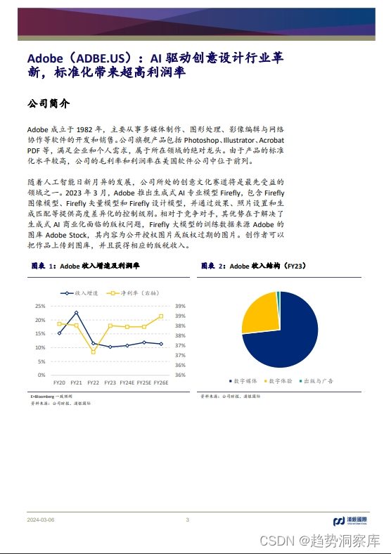 - Adobe:旗舰产品包括Photoshop、Acrobat PDF等,利润率高,创意设计行业可能最先受益于AI。