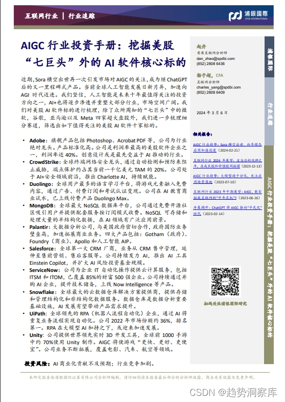 本文分析了人工智能快速发展的行业背景,探讨了AI技术如何重塑各行业,特别是Adobe、CrowdStrike等公司在创意设计、网络安全领域的应用。同时指出AI商业化可能存在风险,但投资机会众多,涉及Adobe、Duolingo等公司的详细分析.