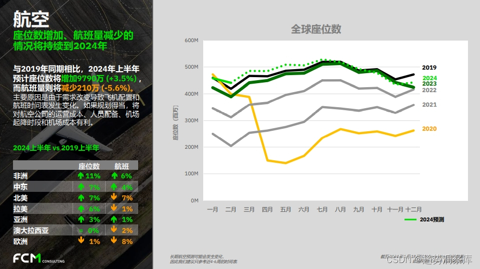 航空座位数和航班量:与2019年相比,预计2024年座位数将上涨3.5%,而航班量将下降5.6%。