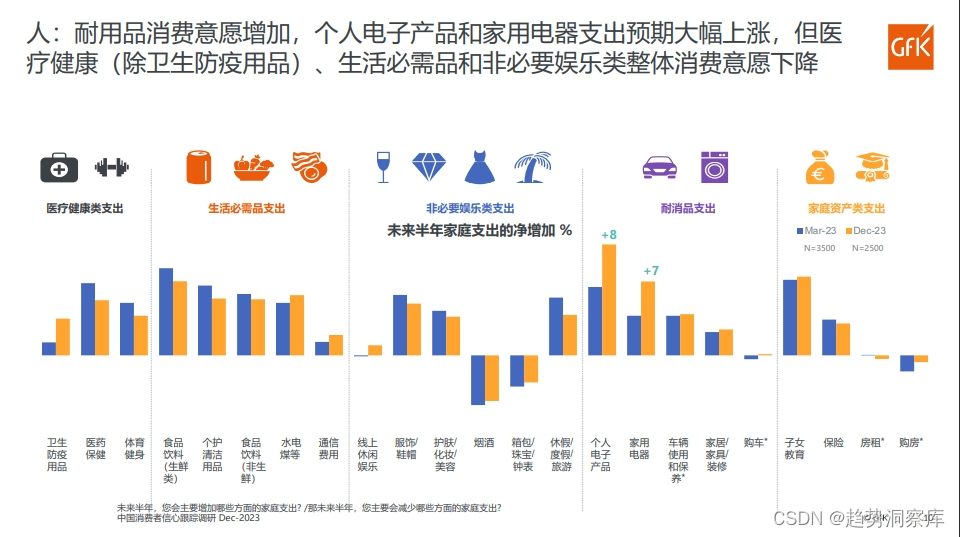 - 消费者在耐用品上的支出意愿增加,特别是个人电子产品和家用电器,但医疗健康、生活必需品和非必要娱乐类的消费意愿下降。