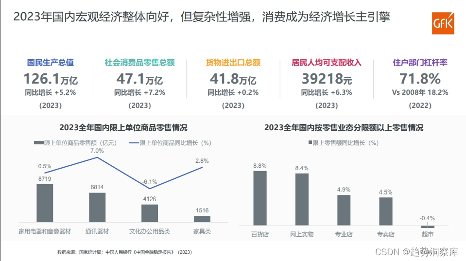 - 2023年中国宏观经济整体向好,消费成为经济增长的主要驱动力。社会消费品零售总额达到47.1万亿人民币,同比增长7.2%。