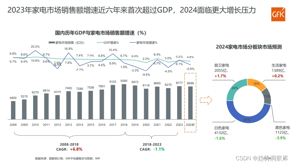 - 家电市场销售额增速近六年来首次超过GDP,显示出家电行业的强劲复苏。2024年家电市场面临更大的增长压力。
