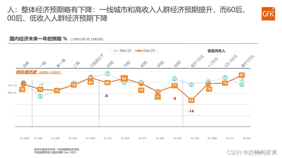 - 消费者信心整体稳定,但不同人群有所差异。一线城市和高收入人群的经济预期提升,而60后、00后和低收入人群的经济预期有所下降。