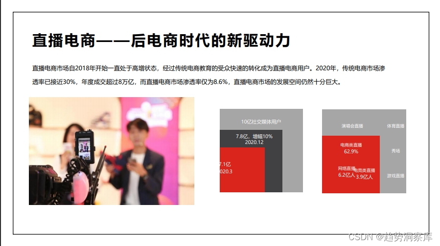 - 直播电商市场自2018年以来持续增长,尽管传统电商市场渗透率接近30%,直播电商的市场渗透率仅为8.6%,表明直播电商市场仍有巨大的发展空间。