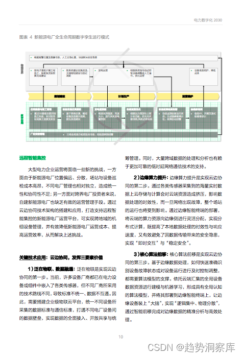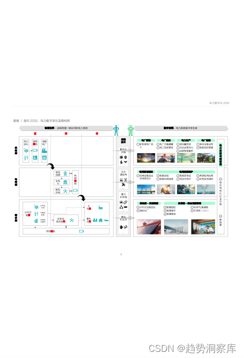 电力数字化场景描绘:报告构想了电力数字化的蓝图,包括数字绿色电厂、电网数字巡检、多源自愈配网、多能协同互补、跨域电力调度和赋能绿色低碳六大核心业务场景。这些场景涵盖了从电厂规划、建设、运营维护到电网巡检、配网调控、电力交易等各个方面。