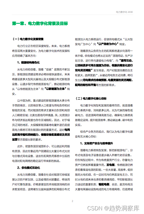 背景与目标:报告指出,实现碳达峰和碳中和是国家的战略目标,电力系统作为实现这一目标的重要途径,需要通过数字化技术提升效率和安全性。电力行业的数字化转型旨在支持资产安全与效率提升、新能源并网消纳、源网荷储协调互动、绿色电能市场化交易和能源低成本高效能使用。