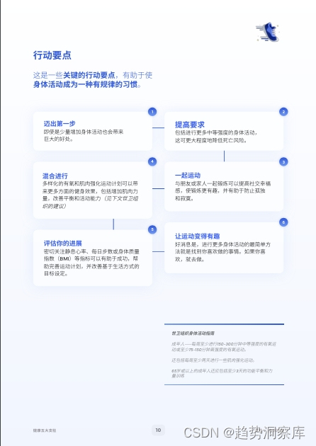 - 提供了一系列改善生活习惯的行动要点,如保持活动、改善饮食、社交等。