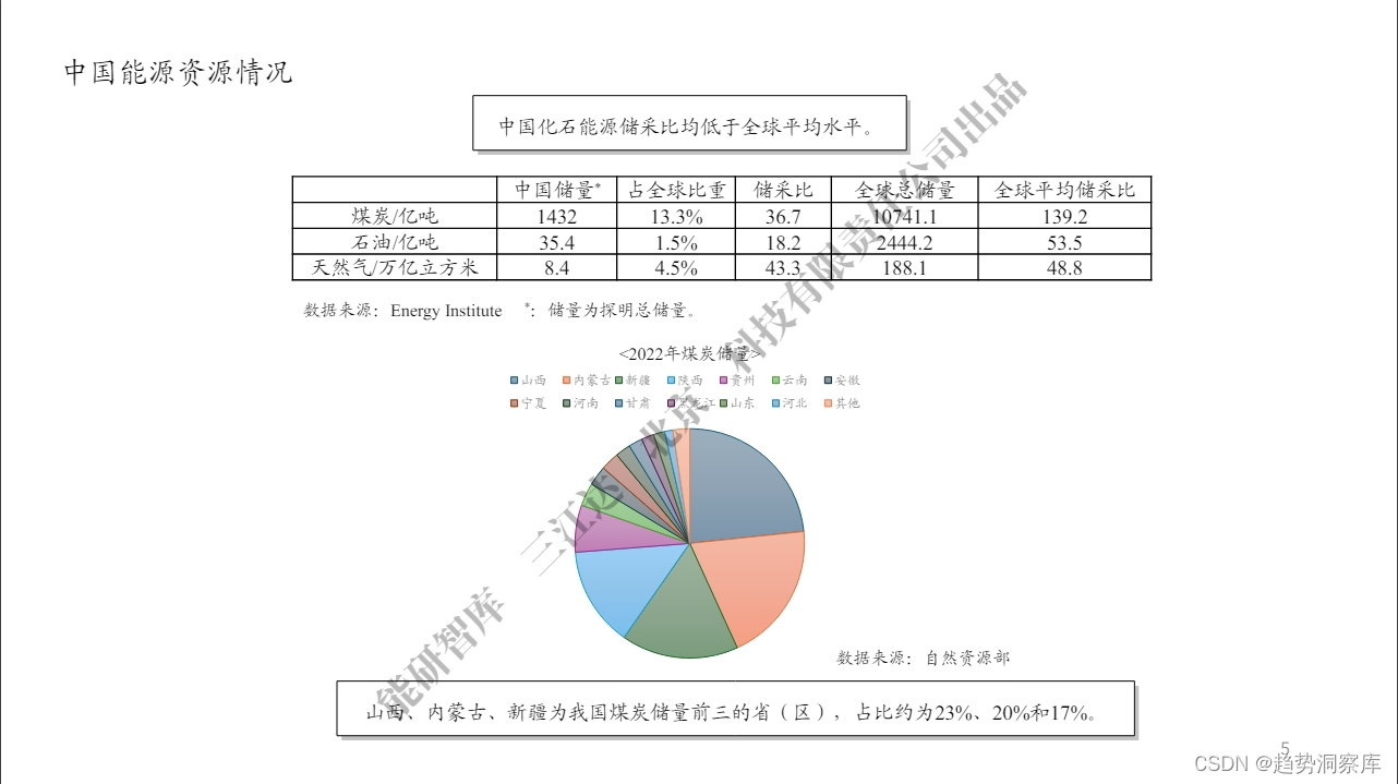 - 煤炭储量主要分布在山西、内蒙古和新疆。