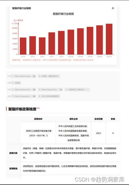 政策梳理:涉及多项政策,包括《纺织工业提质升级实施方案(2023—2025年)》和《关于化纤工业高质量发展的指导意见》等,旨在推动行业技术升级和绿色生产。