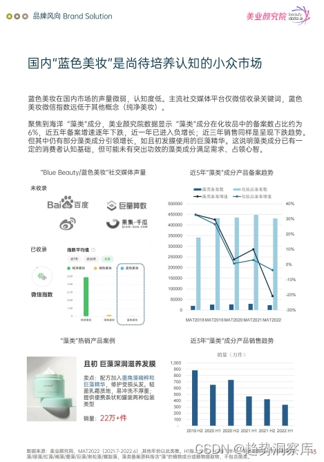 - 中国品牌可以从水上运动爱好者、海源活性物质、从“零碳”、环保的品牌理念出发,开发蓝色色调产品等角度入局“蓝色美妆”。