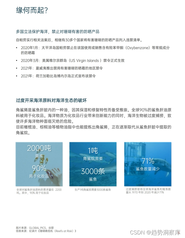 - 海洋污染问题日益严重,联合国宣布2021-2030年为“海洋科学促进可持续发展十年”,美妆领域出现了从“绿色”转向“蓝色”的可持续发展趋势。