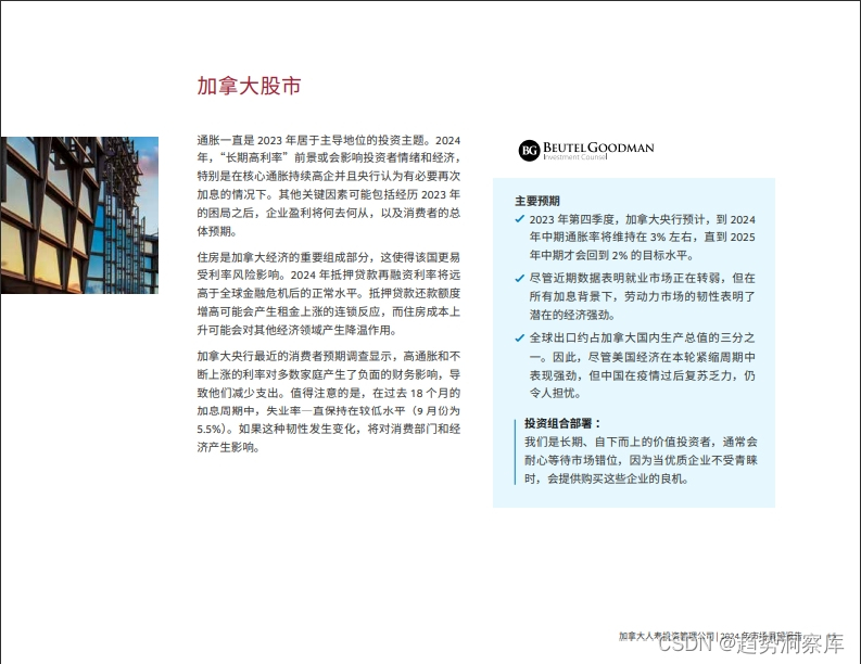 - 2024年,通胀可能已触顶,但劳动力市场紧张和服务业通胀粘性可能导致通胀回落速度慢于预期。预计利率将保持较高水平,可能在2024年下半年开始降息。
