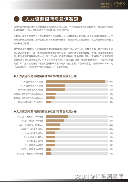 - 人力资源招聘与雇佣赛道:近五成参评机构营业收入超1亿元,三成营业利润超过1亿元。