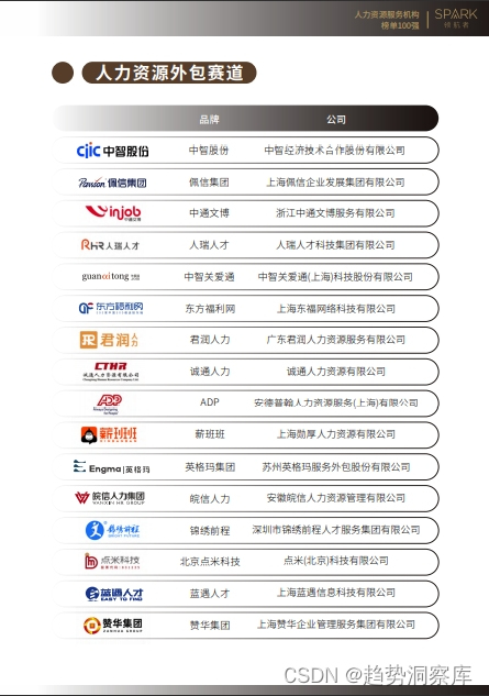 - 介绍了包括中智股份、佩信集团、人瑞人才、中智关爱通、东方福利网、君润人力、诚通人力、ADP、英格玛集团、皖信人力、锦绣前程、点米科技、蓝遇人才、赞华集团、云生集团、万古恒信、BIPO、快乐沃克、善世集团、湘辉人力、博霖集团、起点人力、信鸿、金柚网、远创、华中人才、卡思优派、58魔方、佳诚、优蓝国际、天仁人力、众合云科、广缘集团、AMS、杰成、今元人才、Versal、仁联集团、国华众联等在内的多家企业。