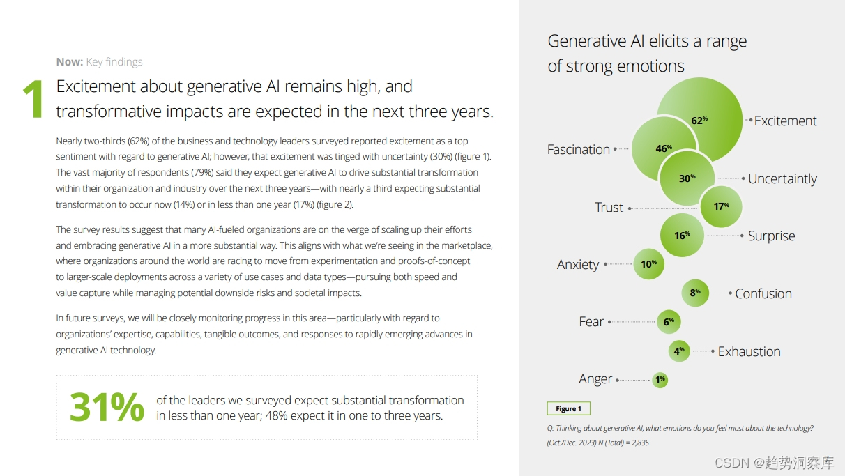 - 大多数受访的商业和技术领导者对生成式AI感到兴奋,并预期在未来三年内将产生变革性影响。