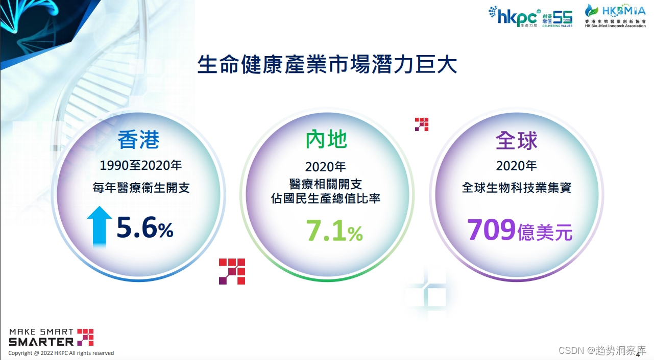 - 强调生命健康产业市场潜力巨大,香港在医疗相关开支占GDP的比率、生物科技业集资等方面表现突出。