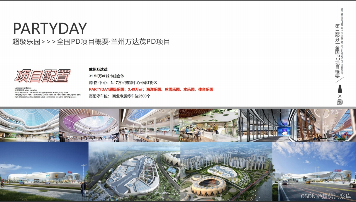 - 介绍了兰州市万达茂PD项目、宝鸡市三迪PD项目、西安市大都荟PD项目和南京市水游城PD项目的概况。