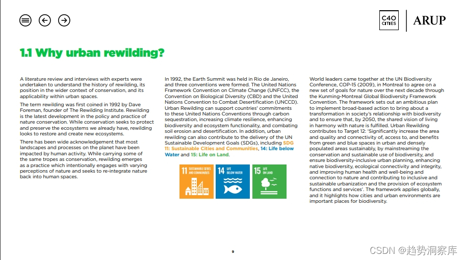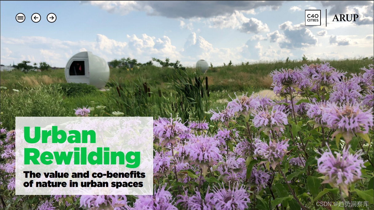城市再野化的重要性:报告强调自然对城市生活的重要性,包括食物、水、健康和福祉。同时指出自然界正面临前所未有的威胁。