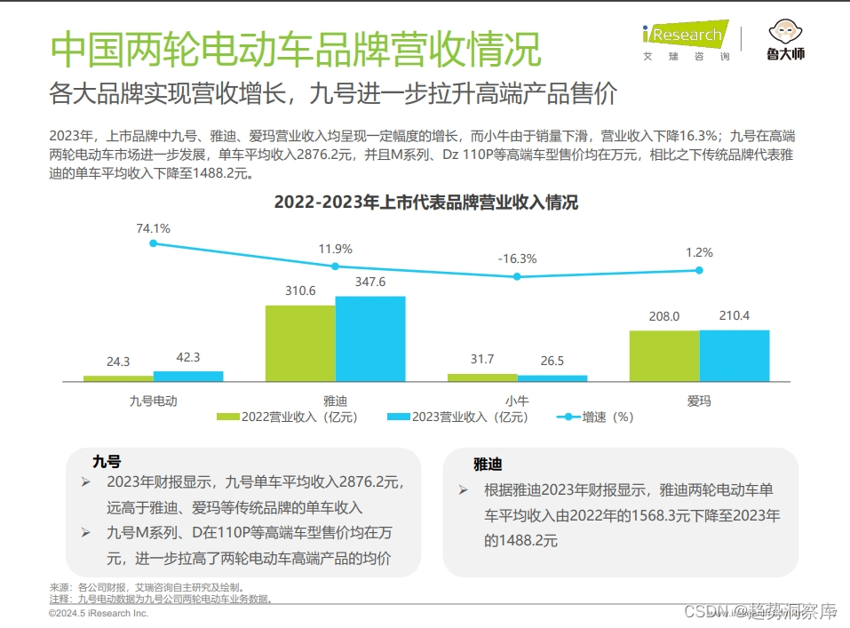 - 九号、雅迪、爱玛等品牌营业收入均呈现增长,其中九号在高端市场进一步发展。