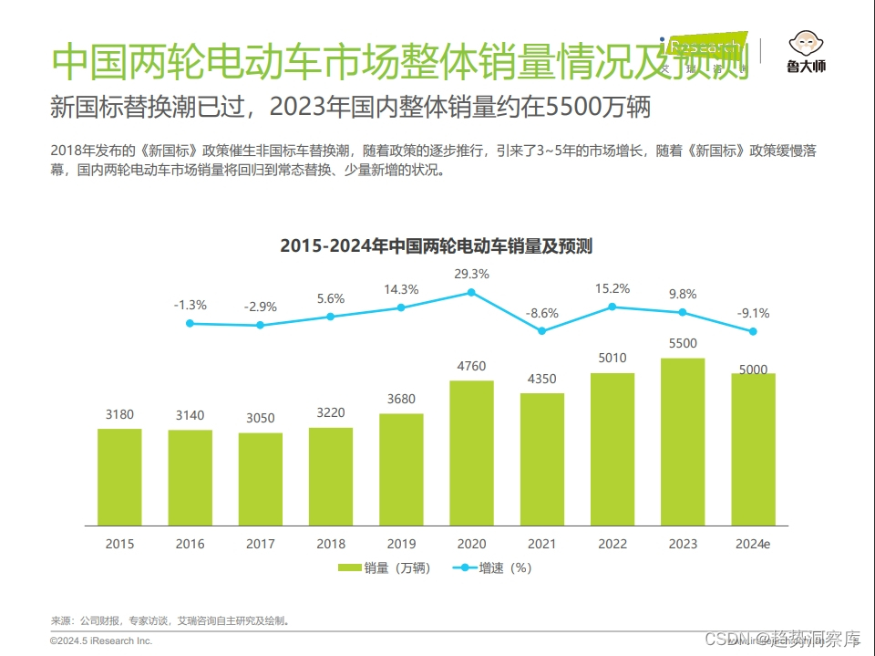 - 2023年中国两轮电动车销量约5500万辆,新国标替换潮已过,市场销量将回归常态。