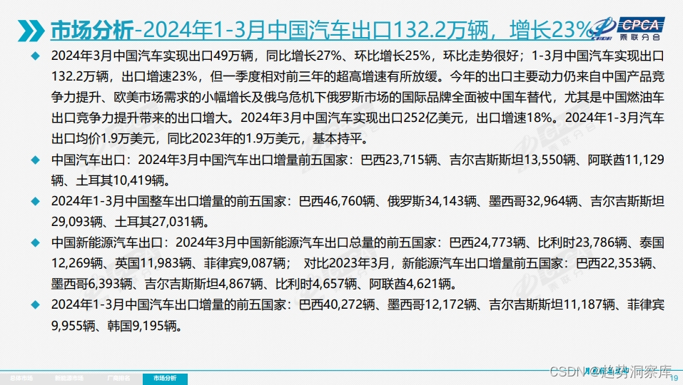 - 2024年1-3月中国汽车出口132.2万辆,增长23%。