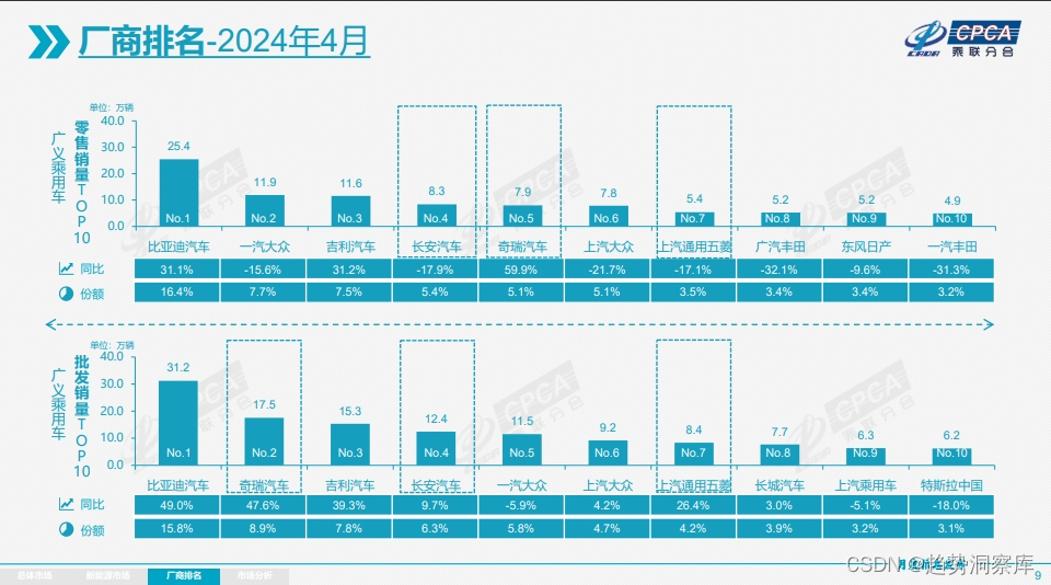 - 4月狭义乘用车零售销量TOP10和批发销量TOP10,广义乘用车零售销量TOP10和批发销量TOP10。