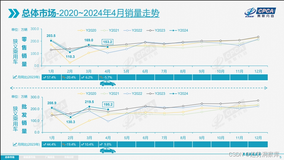 - 2024年4月,全国乘用车市场零售153.2万辆,同比下降5.7%,环比下降9.4%。