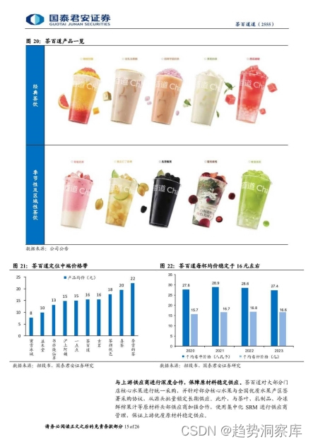 - 茶百道产品组合包括经典茶饮和季节性及区域性茶饮,主力价格带为16元左右。