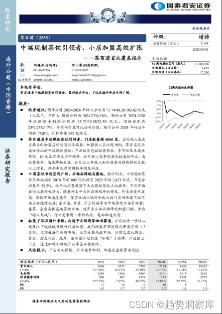- 参考同行业可比公司估值,给予茶百道2024年行业平均的17倍PE,目标市值为289亿港元。
