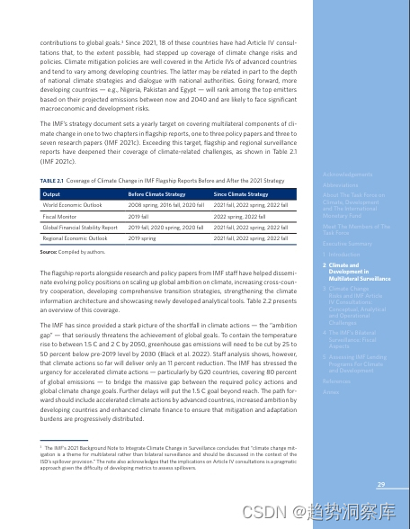 - IMF在2021年发布了气候变化策略,强调气候变化对宏观经济和金融稳定性的影响,并指出IMF的角色是协助协调与气候变化相关的宏观经济和金融政策响应。