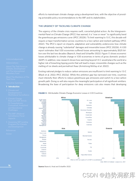- 强调气候变化对国家宏观经济的“宏观关键”影响,IMF在帮助成员国尤其是发展中国家动员投资以实现低碳、社会包容和有韧性的增长路径方面发挥重要作用。