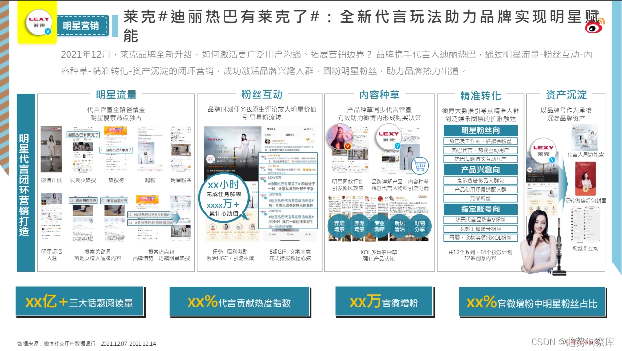 - 品牌全新升级,通过迪丽热巴的代言,实现明星流量、粉丝互动、内容种草、精准转化和资产沉淀的闭环营销。
