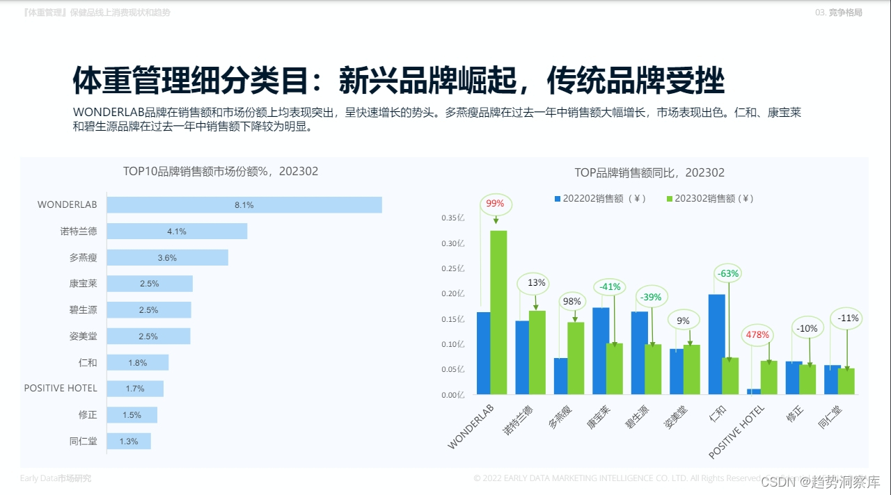 - WONDERLAB品牌销售额和市场份额增长快速,而仁和、康宝莱和碧生源品牌销售额下降。