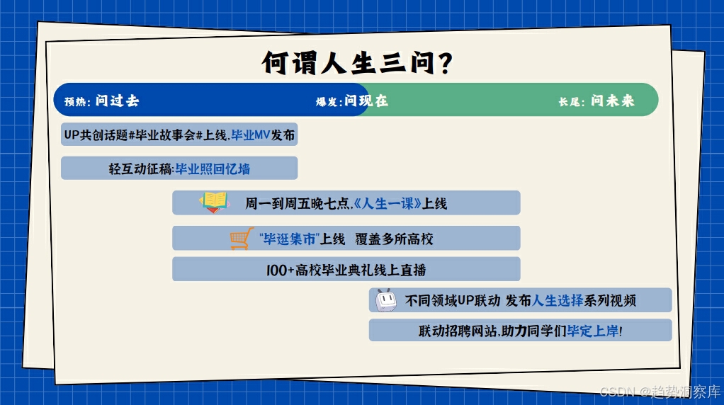 - 预热阶段包括问现在、问未来、问过去等话题,爆发阶段将有长尾活动和联动招聘网站助力毕业生就业。