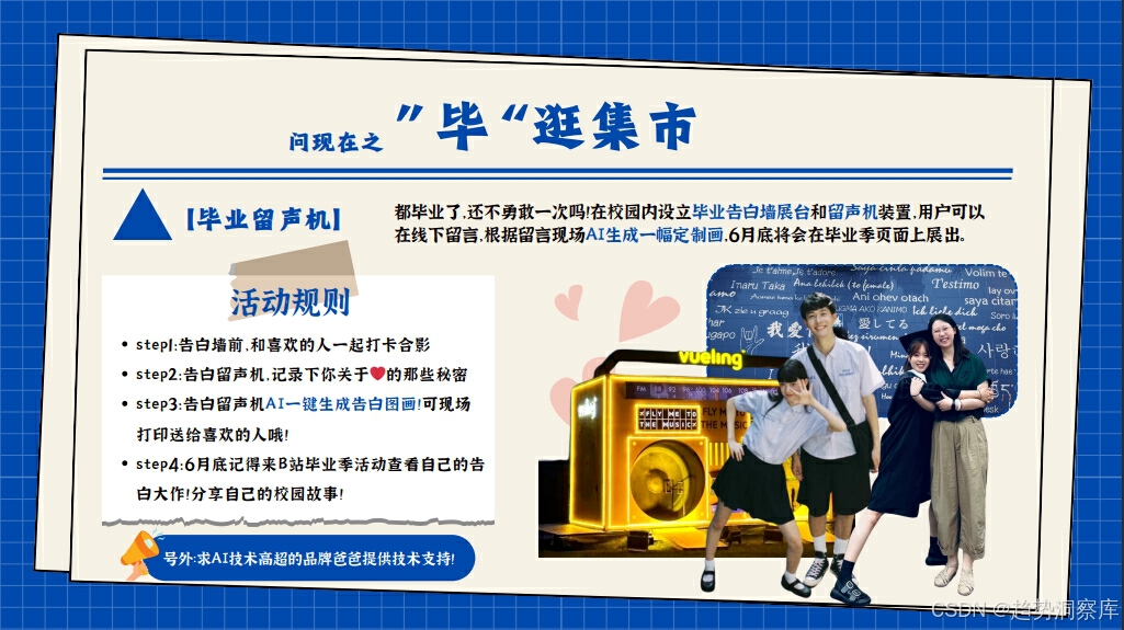 - 毕业照相馆、毕业留声机、毕业签名T恤等,提供现场跟拍、妆造服务,收集毕业生名字制作T恤,以及告白墙和留声机装置。