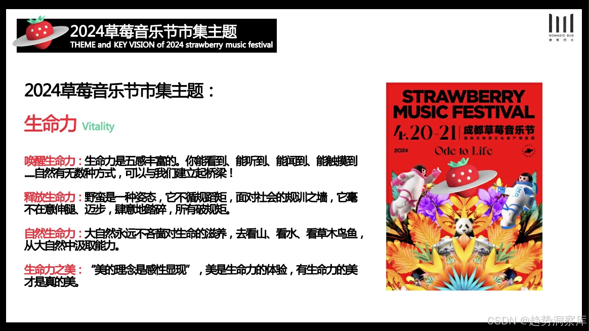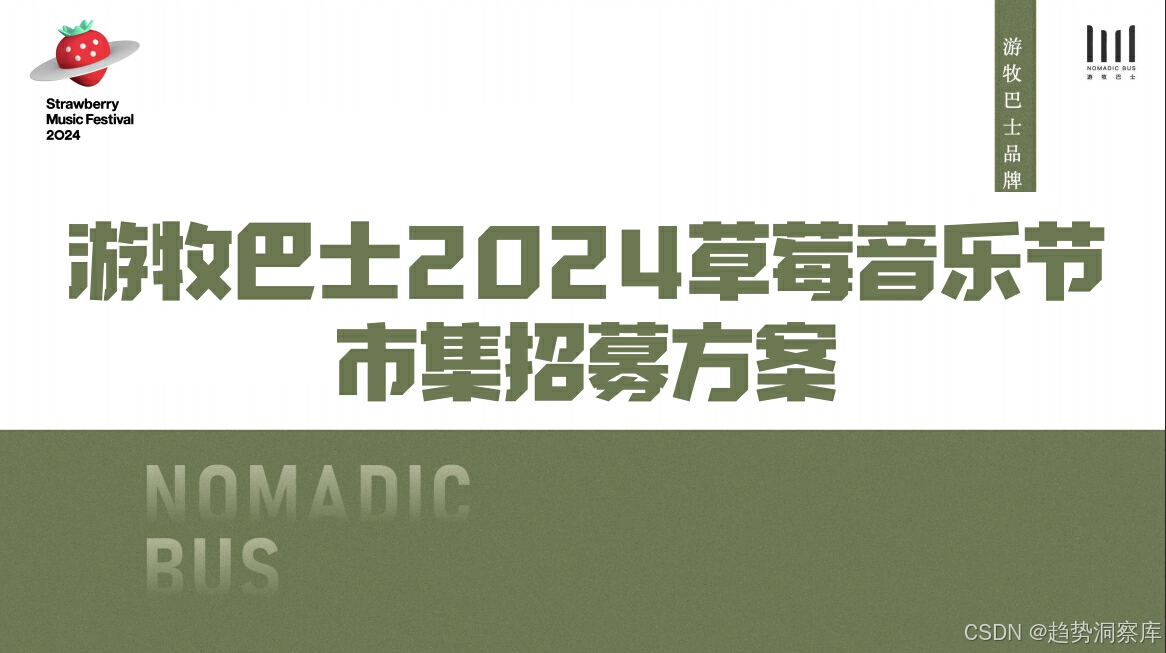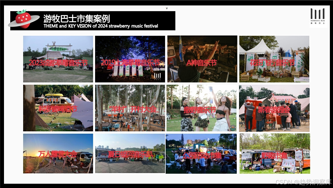 品牌活动案例:展示了游牧巴士市集的案例,包括与草莓音乐节、花田音乐节的合作,以及举办的主题沙龙和创意市集等。