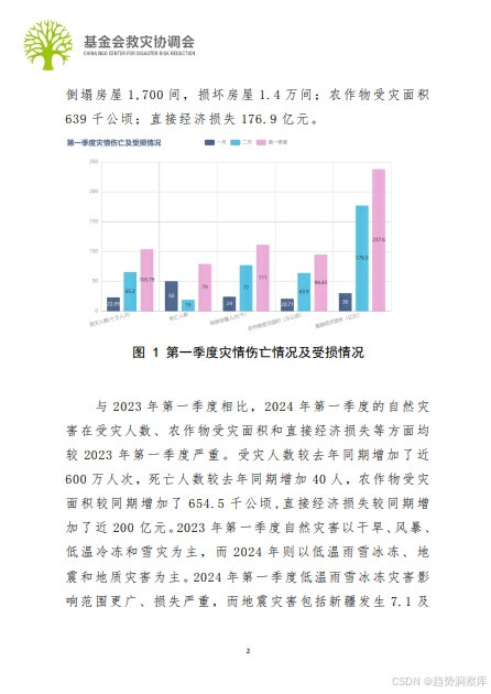 - 2024年第一季度中国自然灾害严重,包括低温雨雪冰冻、地震、地质灾害等。