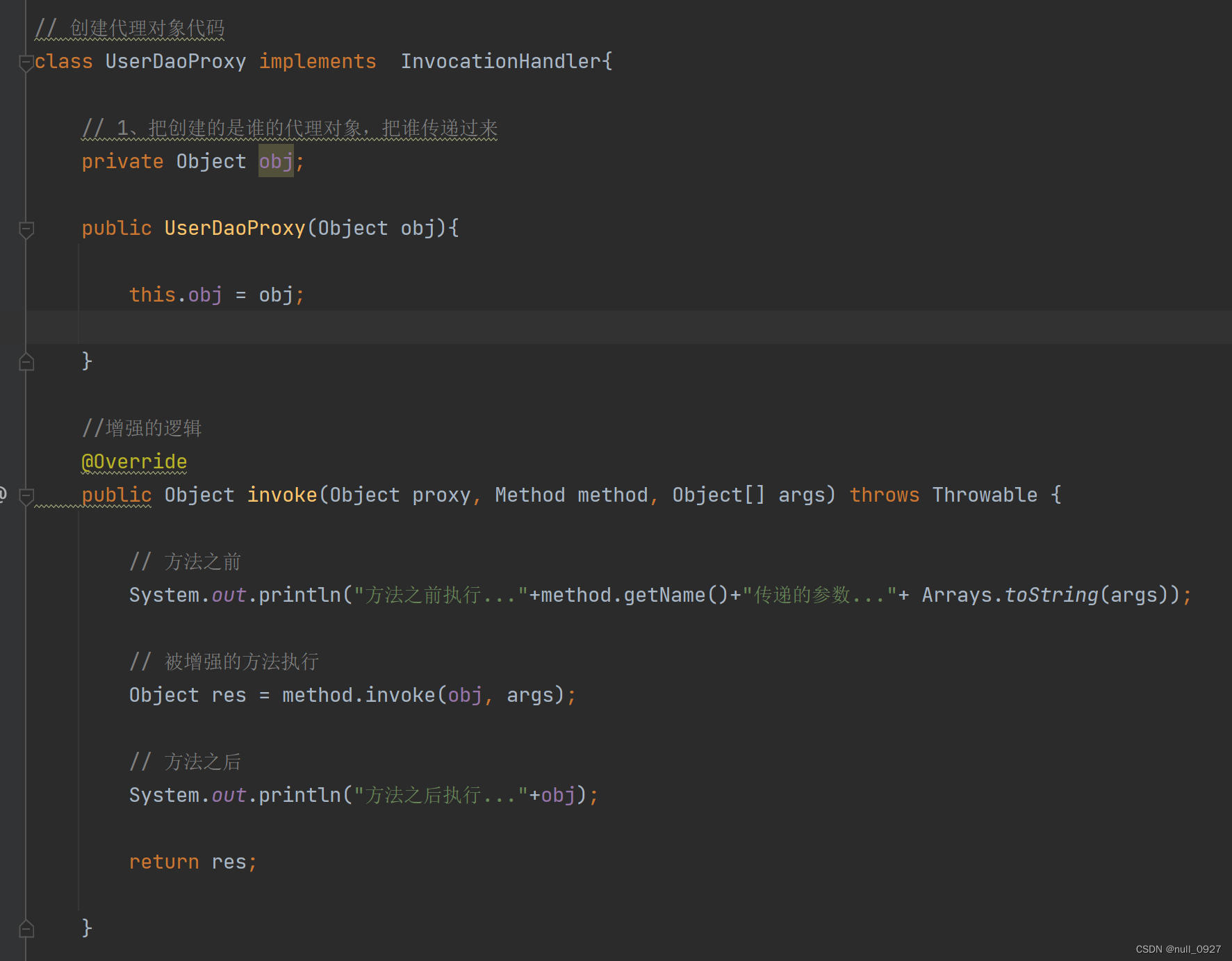 第三个参数:实现这个接口InvocationHandler,创建代理对象,写增强方法。