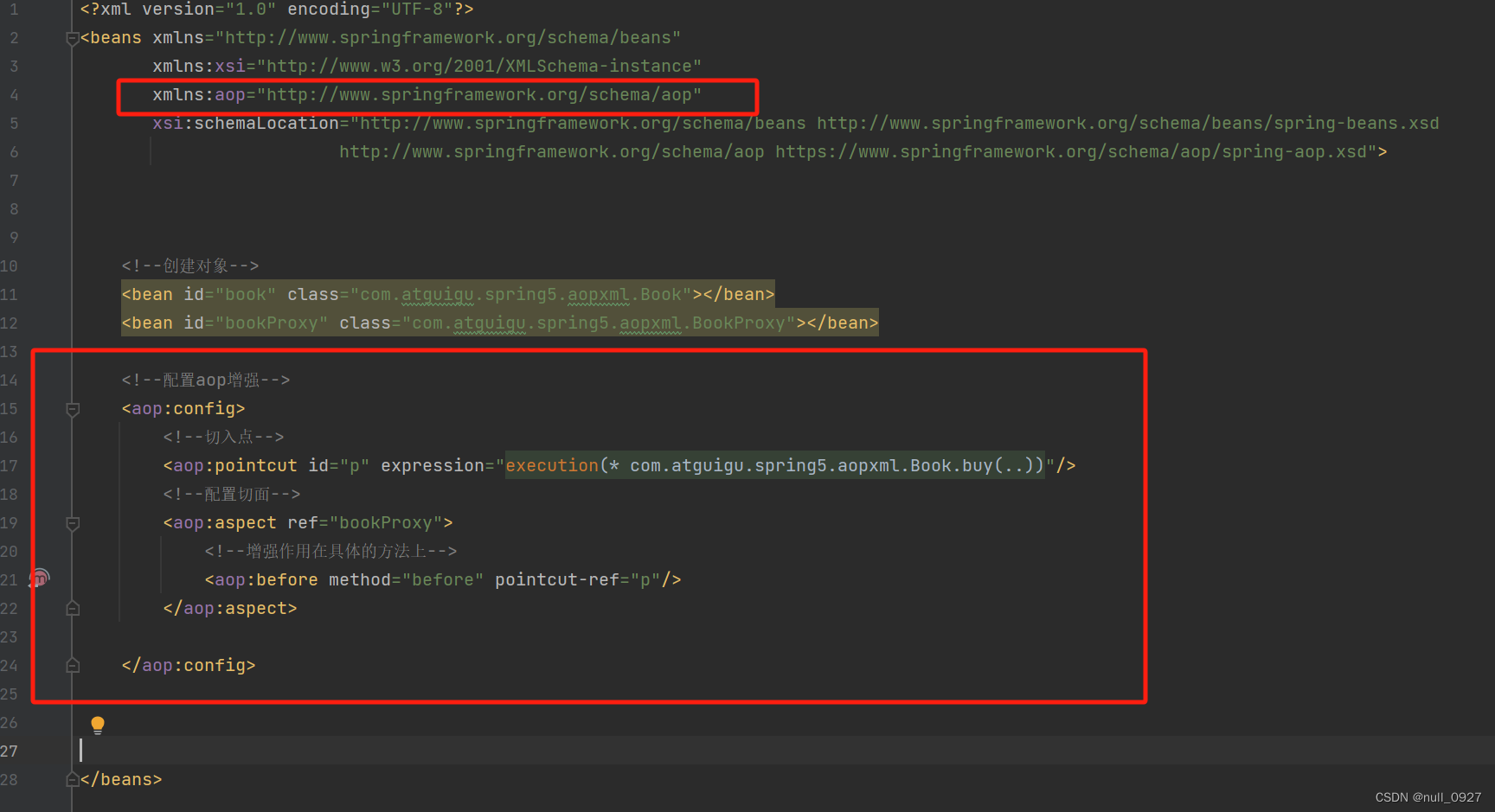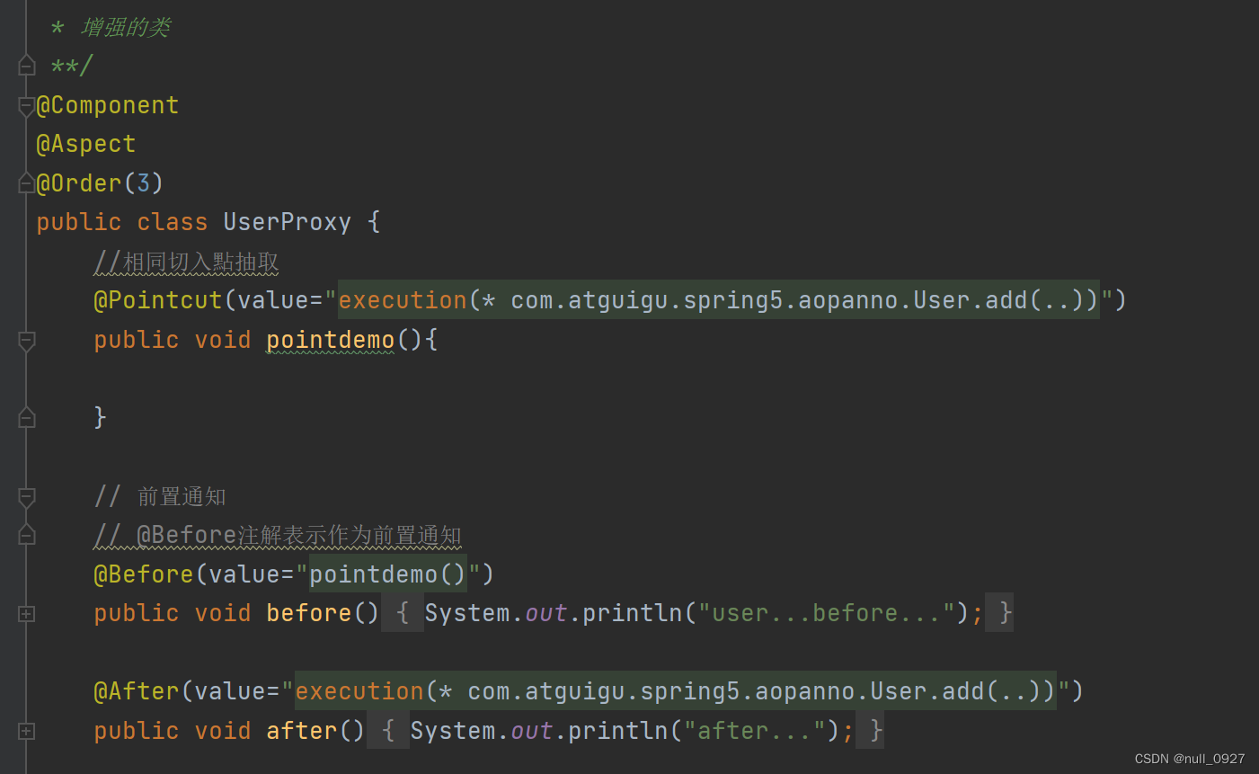 在增强类的里面,在作为通知方法上面,添加通知类型注解,使用切入点表达式配置。