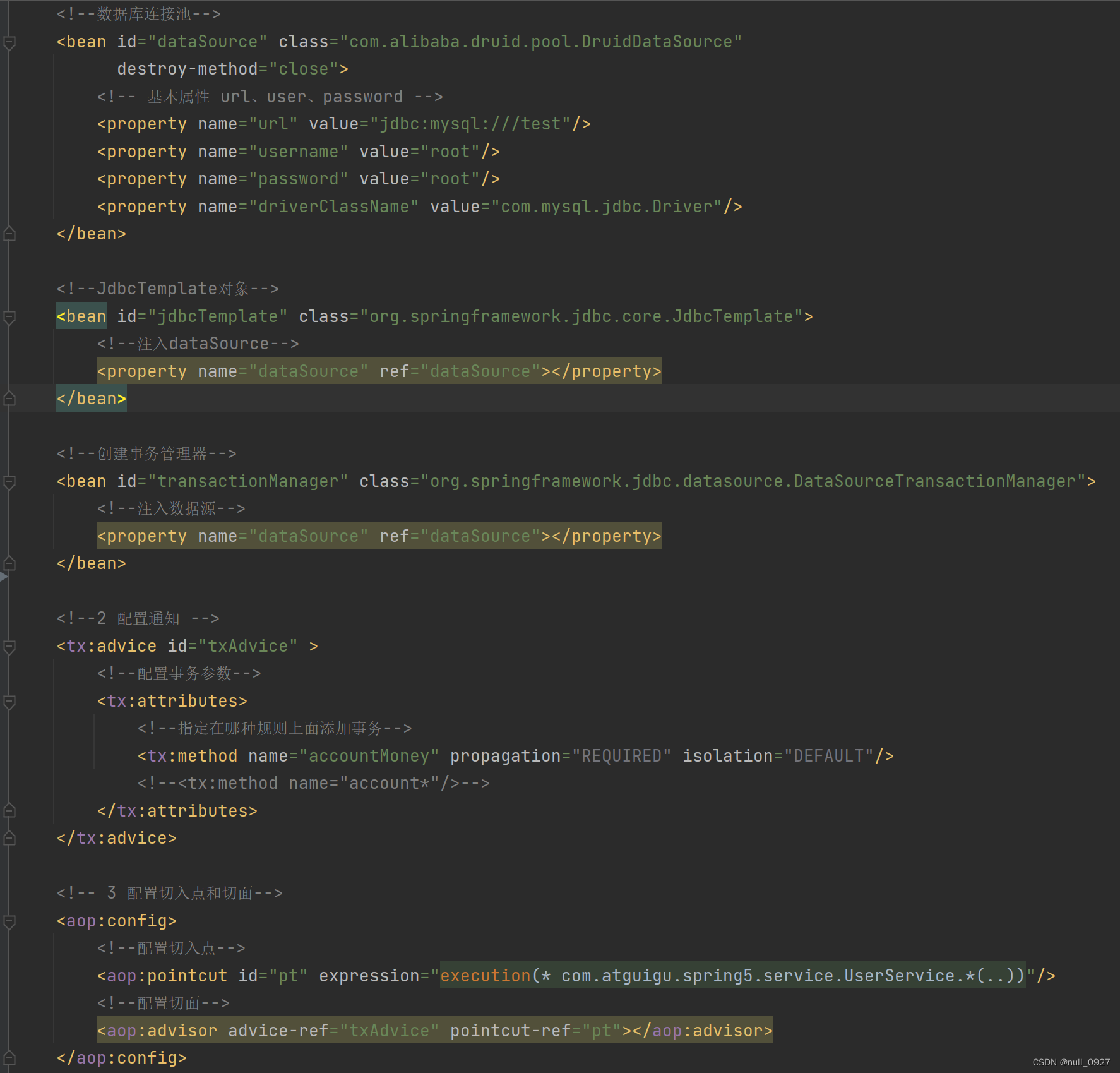 ③service注入dao,dao注入JdbcTemplate,JdbcTemplate注入DataSource。