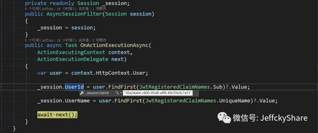 紧接着,比如项目我们使用JWT,则拿到声明中用户标识和用户账号,那么我们接下来我们只需要实现上述异步action过滤器接口即可,如下: