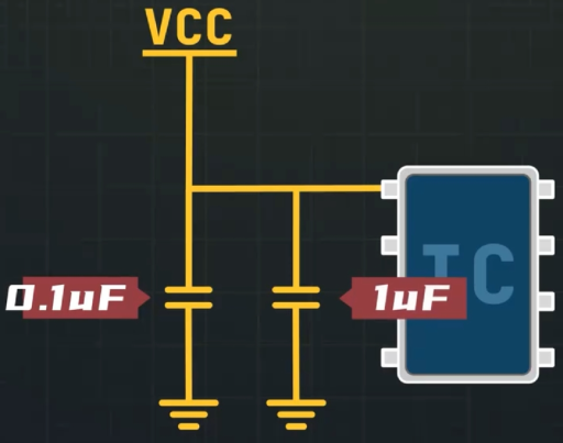 在设计电路的时候,只要用到了芯片,就需要在此芯片的 VCC 引脚放置一个 0.1μF 和 1μF 的陶瓷电容进行滤波,这样可以同时过滤掉大约 6MHz 和 20MHz 的噪声,具体滤波频率需参考电容手册和 layout 实际情况。