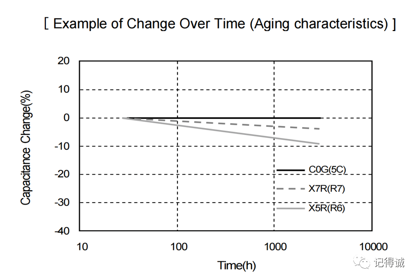 下图反映了电容容量变化率和时间的一个关系。C0G 优于 X7R,优于X5R。